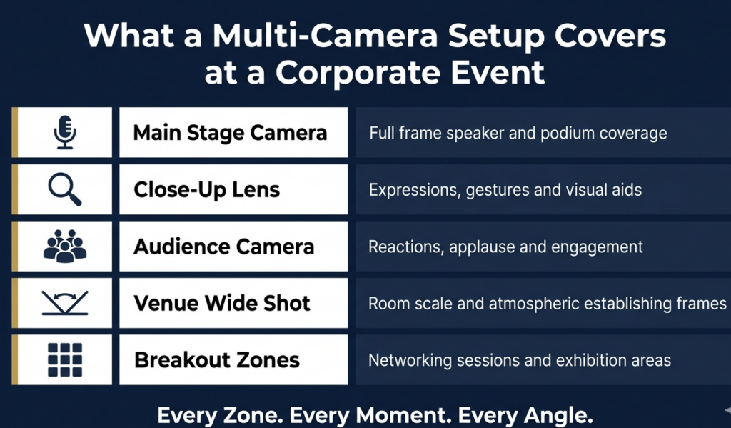 Multiple cameras positioned across a venue solve both problems. Every speaker, every zone, and every unscripted moment has a dedicated lens on it, producing a richer and more complete record of what actually happened.